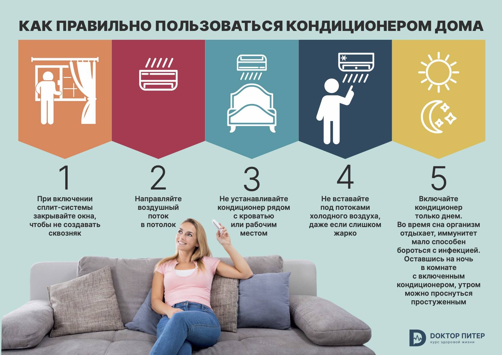 Комфортная разница температур на улице и в помещении — 7−10 градусов. Если жара сильная, температуру воздуха рекомендуется снижать постепенно, на 2−3 градуса в час. Для ночного времени разница может быть меньше, чем днем.